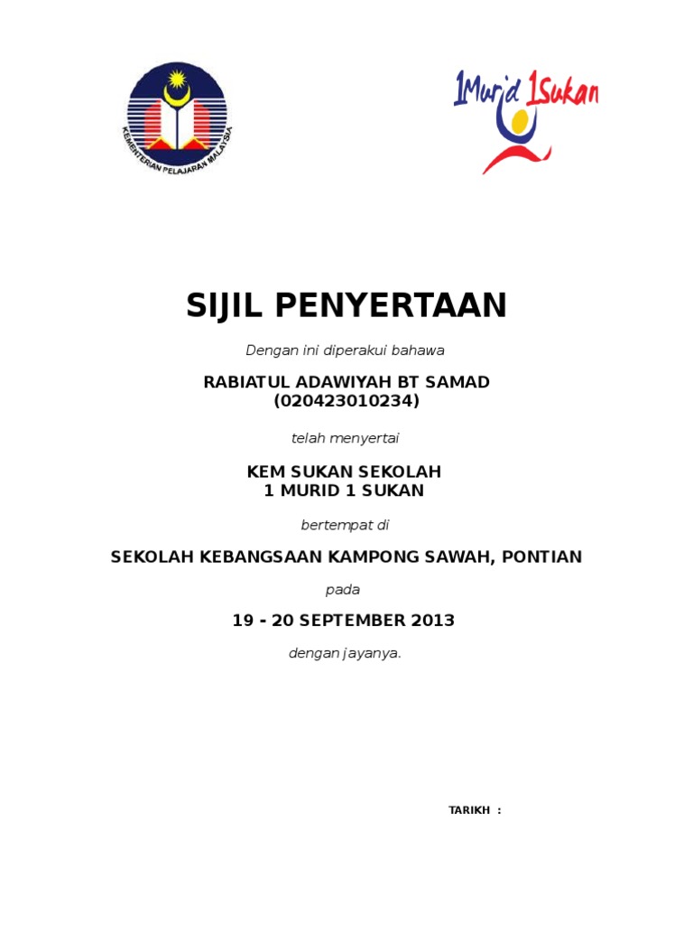 Sijil Penyertaan Kem Sukan Sekolah Pdf